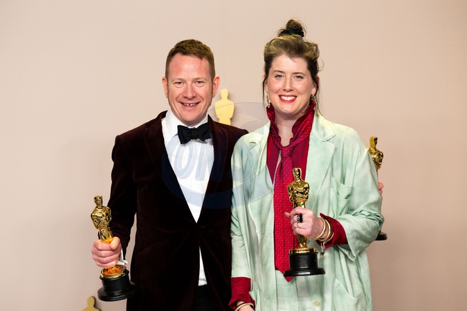 James Price and Shoana Heath pose backstage with the Oscar® for Production Design during the live ABC telecast of the 96th Oscars® at the Dolby® Theatre at Ovation Hollywood on Sunday, March 10, 2024., Credit:Michael Baker / Avalon