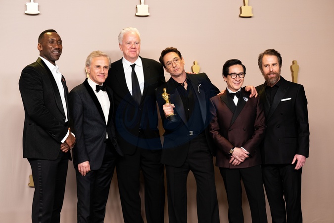 Robert Downey, Jr. poses backstage with the Oscar® for Actor in a Supporting Role and Mahershalah Ali, Christoph Waltz, Tim Robbins, Ke Huy Quan, and Sam Rockwell during the live ABC telecast of the 96th Oscars® at Dolby® Theatre at Ovation Hollywood on Sunday, March 10, 2024., Credit:SI / Avalon