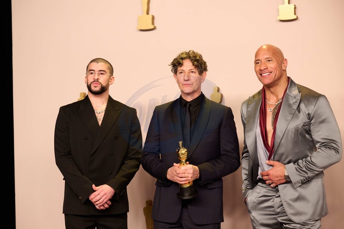 Presenters Dwayne Johnson and Bad Bunny pose with Jonathan Glazer and his Oscar® for International Feature Film during the live ABC telecast of the 96th Oscars® at Dolby® Theatre at Ovation Hollywood on Sunday, March 10, 2024., Credit:Michael Baker / Avalon