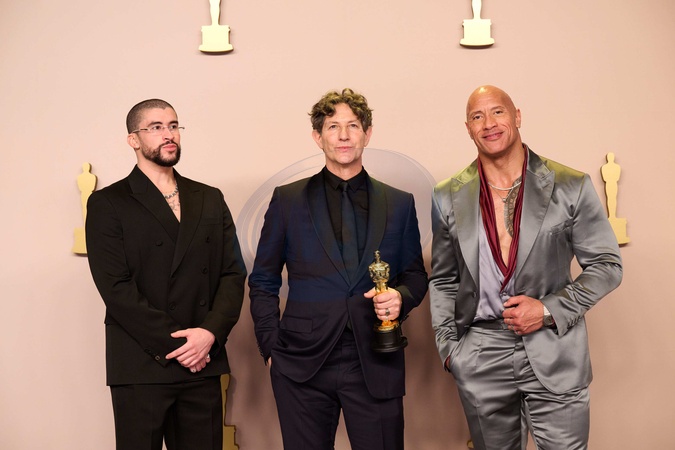 Presenters Dwayne Johnson and Bad Bunny pose with Jonathan Glazer and his Oscar® for International Feature Film during the live ABC telecast of the 96th Oscars® at Dolby® Theatre at Ovation Hollywood on Sunday, March 10, 2024., Credit:Michael Baker / Avalon