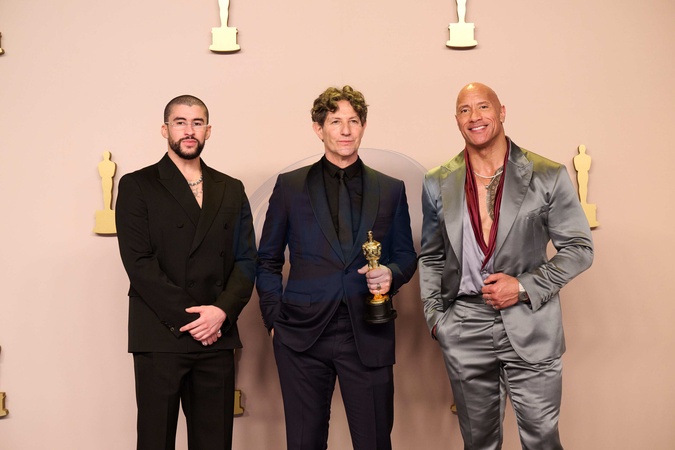Presenters Dwayne Johnson and Bad Bunny pose with Jonathan Glazer and his Oscar® for International Feature Film during the live ABC telecast of the 96th Oscars® at Dolby® Theatre at Ovation Hollywood on Sunday, March 10, 2024., Credit:Michael Baker / Avalon
