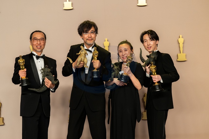 Masaki Takahashi, Takashi Yamazaki, Kiyoko Shibuya and Tatsuji Nojima pose backstage with the Oscar® for Visual Effects during the live ABC telecast of the 96th Oscars® at Dolby® Theatre at Ovation Hollywood on Sunday, March 10, 2024., Credit:AL / Avalon