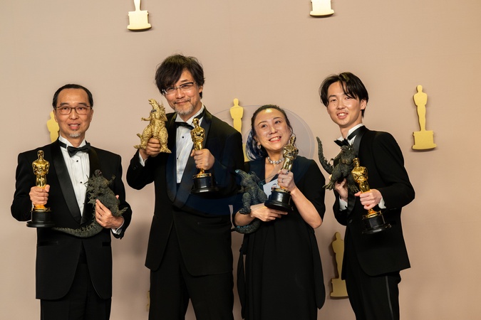Masaki Takahashi, Takashi Yamazaki, Kiyoko Shibuya and Tatsuji Nojima pose backstage with the Oscar® for Visual Effects during the live ABC telecast of the 96th Oscars® at Dolby® Theatre at Ovation Hollywood on Sunday, March 10, 2024., Credit:AL / Avalon