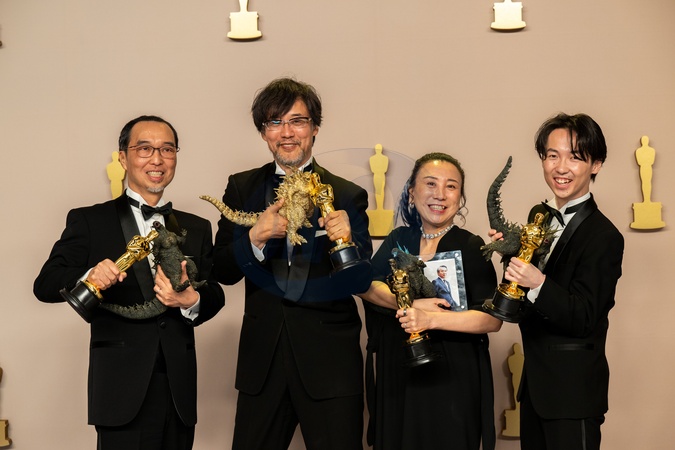 Masaki Takahashi, Takashi Yamazaki, Kiyoko Shibuya and Tatsuji Nojima pose backstage with the Oscar® for Visual Effects during the live ABC telecast of the 96th Oscars® at Dolby® Theatre at Ovation Hollywood on Sunday, March 10, 2024., Credit:AL / Avalon