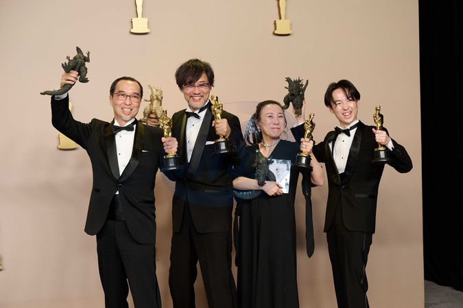 Masaki Takahashi, Takashi Yamazaki, Kiyoko Shibuya and Tatsuji Nojima pose with the Oscar® for Visual Effects during the live ABC telecast of the 96th Oscars® at the Dolby® Theatre at Ovation Hollywood on Sunday, March 10, 2024., Credit:Michael Baker / Avalon