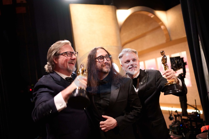 Brad Booker, Dave Mullins and Sean Lennon pose backstage with the Oscar® for Animated Short Film during the live ABC telecast of the 96th Oscars® at Dolby® Theatre at Ovation Hollywood on Sunday, March 10, 2024., Credit:Richard Harbaugh ©A.M.P.A.S. / Avalon
