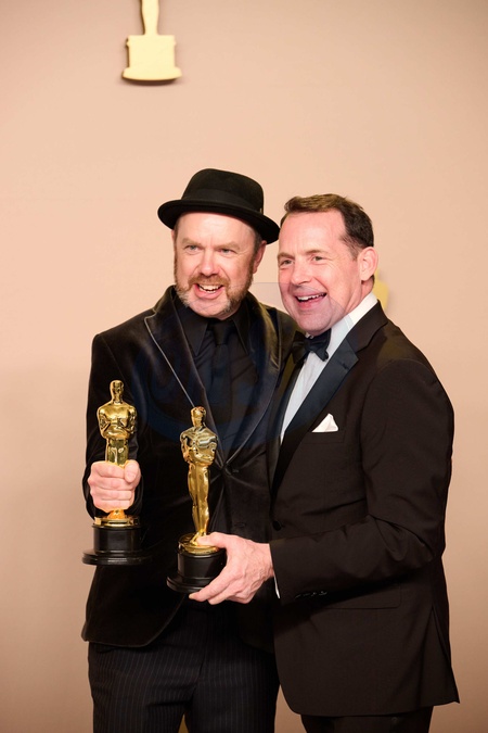 Tarn Willers and Johnnie Burn pose backstage with the Oscar® for Sound during the live ABC telecast of the 96th Oscars® at Dolby® Theatre at Ovation Hollywood on Sunday, March 10, 2024., Credit:AL / Avalon