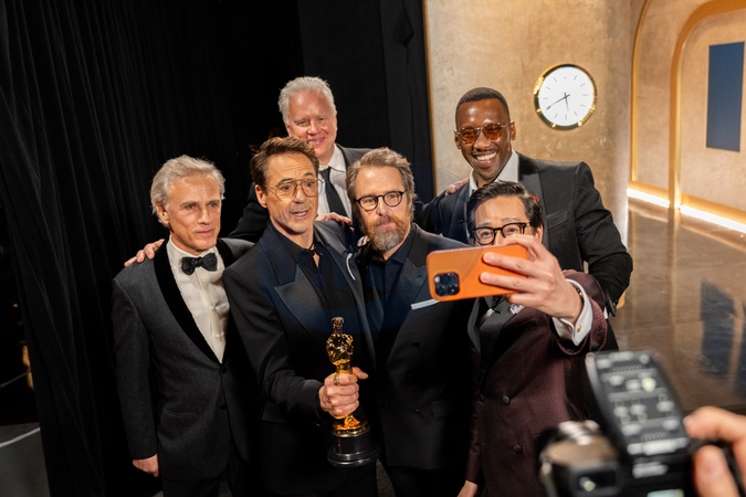 Robert Downey, Jr. backstage with the Oscar® for Actor in a Supporting Role and Christoph Waltz, Tim Robbins, Sam Rockwell, Mahershalah Ali, and Ke Huy Yuan during the live ABC telecast of the 96th Oscars® at Dolby® Theatre at Ovation Hollywood on Sunday, March 10, 2024., Credit:SI / Avalon