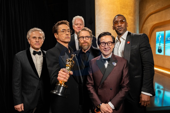 Robert Downey, Jr. backstage with the Oscar® for Actor in a Supporting Role and Christoph Waltz, Tim Robbins, Sam Rockwell, Mahershalah Ali, and Ke Huy Yuan during the live ABC telecast of the 96th Oscars® at Dolby® Theatre at Ovation Hollywood on Sunday, March 10, 2024., Credit:SI / Avalon