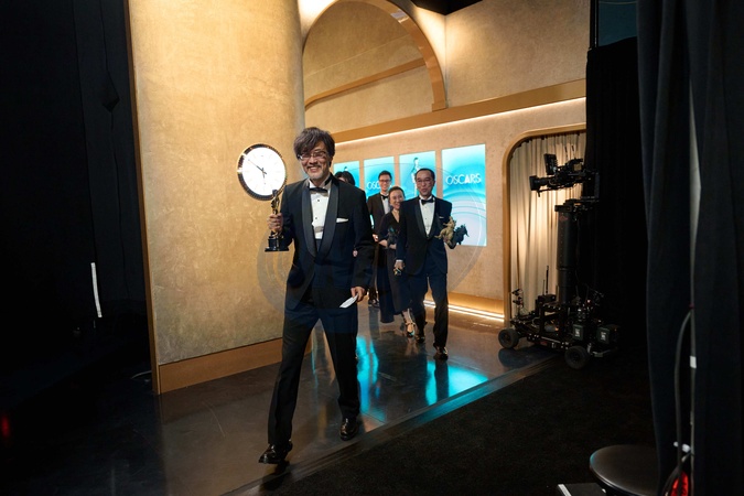 Takashi Yamazaki, Tatsuji Nojima, Masaki Takahashi, and Kiyoko Shibuya backstage with the Oscar® for Visual Effects during the live ABC telecast of the 96th Oscars® at Dolby® Theatre at Ovation Hollywood on Sunday, March 10, 2024., Credit:AL / Avalon