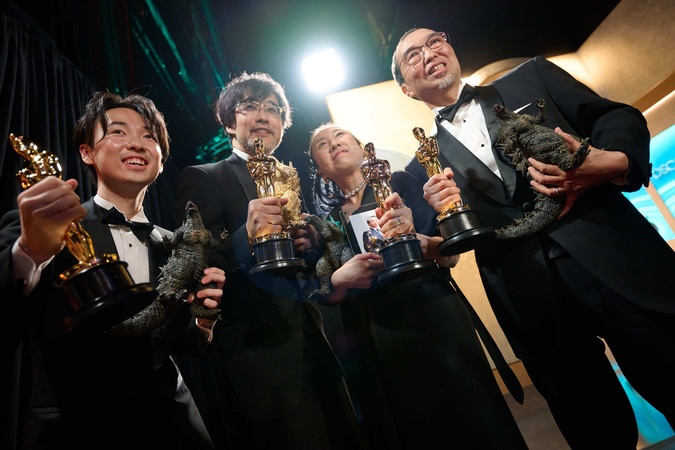 Tatsuji Nojima, Takashi Yamazaki, Kiyoko Shibuya, and Masaki Takahashi pose backstage with the Oscar® for Visual Effects during the live ABC telecast of the 96th Oscars® at Dolby® Theatre at Ovation Hollywood on Sunday, March 10, 2024., Credit:AL / Avalon