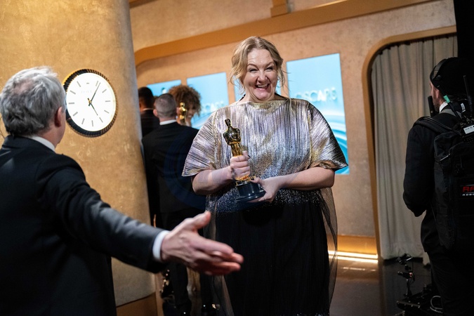 Nadia Stacey poses backstage with the Oscar® for Makeup and Hairstyling during the live ABC telecast of the 96th Oscars® at the Dolby® Theatre at Ovation Hollywood on Sunday, March 10, 2024., Credit:SI / Avalon