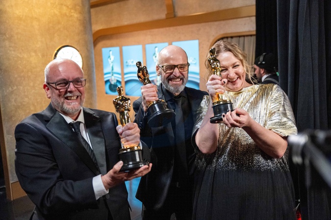 Mark Coulier, Josh Weston, and Nadia Stacey pose backstage with the Oscar® for Makeup and Hairstyling during the live ABC telecast of the 96th Oscars® at the Dolby® Theatre at Ovation Hollywood on Sunday, March 10, 2024., Credit:SI / Avalon