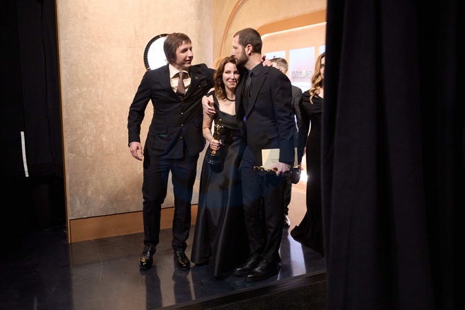 Raney Aronson-Rath, Mstyslav Chernov and Michelle Mizner pose backstage with the Oscar® for Documentary Feature Film during the live ABC telecast of the 96th Oscars® at Dolby® Theatre at Ovation Hollywood on Sunday, March 10, 2024., Credit:AL / Avalon