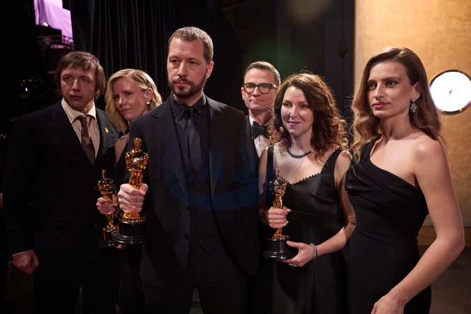 Raney Aronson-Rath, Mstyslav Chernov and Michelle Mizner pose backstage with the Oscar® for Documentary Feature Film during the live ABC telecast of the 96th Oscars® at Dolby® Theatre at Ovation Hollywood on Sunday, March 10, 2024., Credit:AL / Avalon