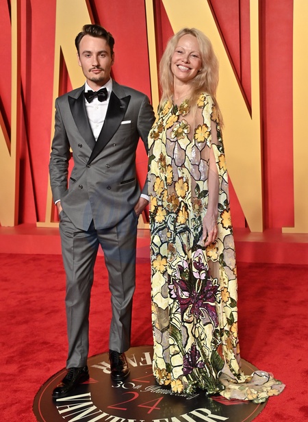 Brandon Lee and Pamela Anderson arriving at the Vanity Fair Oscar Party held at the Wallis Annenberg Center for the Performing Arts on March 10, 2024 in Beverly Hills, CA.© OConnor-Arroyo / AFF-USA.com