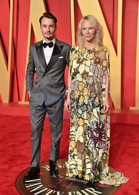 Brandon Lee and Pamela Anderson arriving at the Vanity Fair Oscar Party held at the Wallis Annenberg Center for the Performing Arts on March 10, 2024 in Beverly Hills, CA.© OConnor-Arroyo / AFF-USA.com