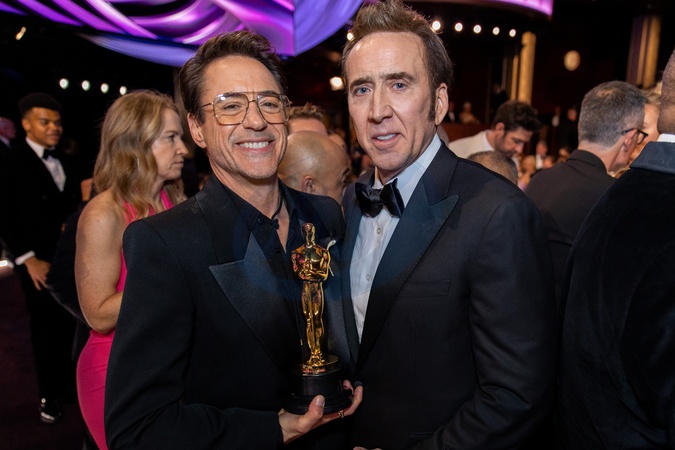 Oscar® winner Robert Downey, Jr. poses with Nicolas Cage at the 96th Oscars® at Dolby® Theatre at Ovation Hollywood on Sunday, March 10, 2024., Credit:SI / Avalon