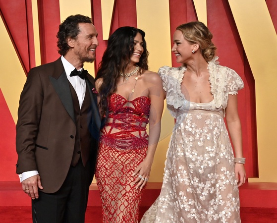 Matthew McConaughey, Camilla Alves and Jennifer Lawrence arriving at the Vanity Fair Oscar Party held at the Wallis Annenberg Center for the Performing Arts on March 10, 2024 in Beverly Hills, CA.© OConnor-Arroyo / AFF-USA.com