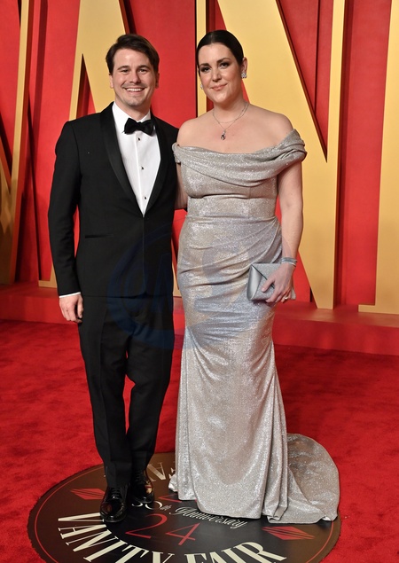 Jason Ritter and Melanie Lynskey arriving at the Vanity Fair Oscar Party held at the Wallis Annenberg Center for the Performing Arts on March 10, 2024 in Beverly Hills, CA.© OConnor-Arroyo / AFF-USA.com