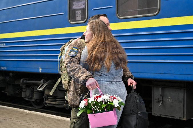 LVIV, UKRAINE - FEBRUARY 27, 2024 - Composer, pianist, music producer, serviceman of the 59th Separate Infantry Brigade named after Yakiv Handziuk of the Armed Forces of Ukraine, musician of the Cultural Landing Mykhailo Oliynyk and his wife, musicologist, researcher at the Solomiia Krushelnytska Music Memorial Museum, PR manager of the Mariia Zankovetska National Drama Theater Stefaniia Oliynyk meet at the railway station, Lviv, western Ukraine., Credit:Anastasiia Smolienko / Avalon