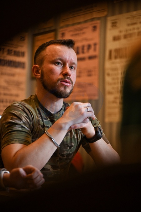 LVIV, UKRAINE - FEBRUARY 27, 2024 - Composer, pianist, music producer, serviceman of the 59th Separate Infantry Brigade named after Yakiv Handziuk of the Armed Forces of Ukraine, musician of the Cultural Landing Mykhailo Oliynyk is pictured during the interview to a correspondent of the Ukrinform Ukrainian National News Agency, Lviv, western Ukraine., Credit:Anastasiia Smolienko / Avalon