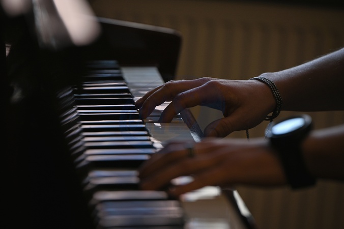 LVIV, UKRAINE - FEBRUARY 27, 2024 - Composer, pianist, music producer, serviceman of the 59th Separate Infantry Brigade named after Yakiv Handziuk of the Armed Forces of Ukraine, musician of the Cultural Landing Mykhailo Oliynyk plays the piano during the interview to a correspondent of the Ukrinform Ukrainian National News Agency, Lviv, western Ukraine., Credit:Anastasiia Smolienko / Avalon