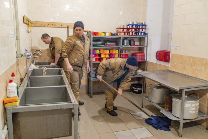 UKRAINE - MARCH 17, 2024 - Russian POWs clean the dining room-kitchen at the detention camp, Ukraine., Credit:Pavlo_Bagmut / Avalon