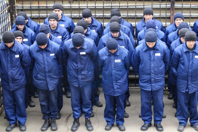 UKRAINE - MARCH 17, 2024 - Russian POWs in blue uniforms line up in front of a barrack in the detention camp, Ukraine., Credit:Pavlo_Bagmut / Avalon