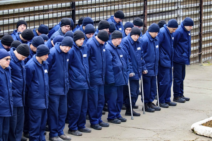 UKRAINE - MARCH 17, 2024 - Russian POWs in blue uniforms line up in front of a barrack in the detention camp, Ukraine., Credit:Pavlo_Bagmut / Avalon