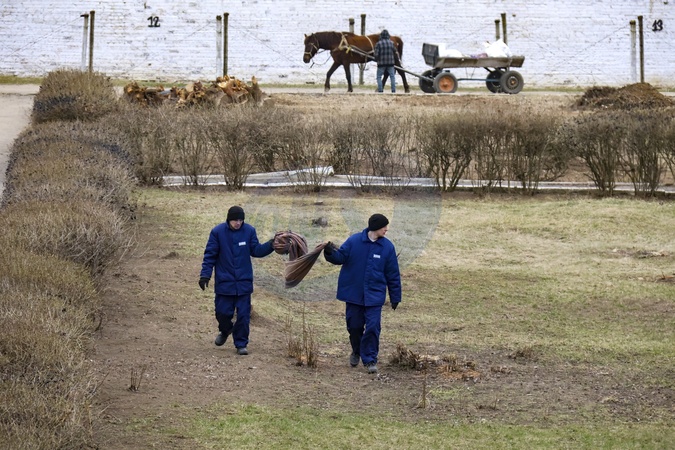 UKRAINE - MARCH 17, 2024 - Russian POWs collect dry leaves and branches on the premises of the detention camp, Ukraine., Credit:Pavlo_Bagmut / Avalon