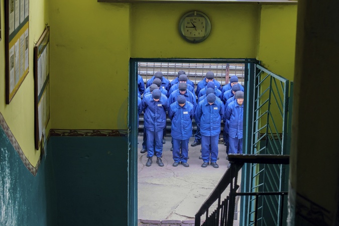 UKRAINE - MARCH 17, 2024 - Russian POWs in blue uniforms line up in front of a barrack in the detention camp, Ukraine., Credit:Pavlo_Bagmut / Avalon
