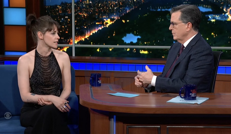 Pictures must credit: CBS Twilight actress Kristen Stewart used a TV chat show to tell trolls "f you” after her controversial magazine cover —posing in a jock strap. The openly gay star, 33, did the pose for US entertainment magazine Rolling Stone. Kristen, who has also played the late Princess Diana in royal movie Spencer, faced a lot of online hate for the photo which referenced her new movie, Love Lies Bleeding. She spoke out when she appeared on the Late Show with Stephen Colbert to promote the crime thriller in which she plays a gym receptionist who gets dragged into a criminal underworld. Picture supplied by JLPPA