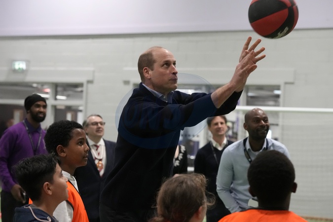 Prince William throws a basketball watched by young people during his visit to WEST, the new OnSide Youth Zone in Hammersmith and Fulham in London, Thursday, March 14, 2024. Named WEST (standing for 'Where Everyone Sticks Together') by local young people, the new Youth Zone will be staffed by skilled and dedicated youth workers who will support young people from across west London to develop the skills and confidence they need to achieve their dreams., Credit:Frank Augstein / Avalon