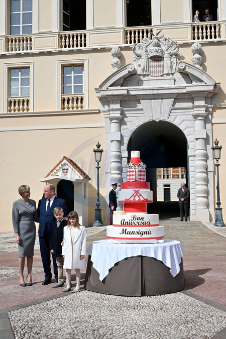 No Tabloid - Le prince Albert II de Monaco fête son anniversaire (66 ans) avec la princesse Charlène de Monaco et leurs enfants, le prince Jacques de Monaco, marquis des Baux, et la princesse Gabriella de Monaco, comtesse de Carladès, sur la Place du Palais princier de Monaco, le 14 mars 2024. © Bruno Bebert/Bestimage No Web pour la Belgique et la Suisse Just for Hello, OK and Grazia for UK - No Tabloid - Prince of Monaco celebrates his birthday (66 years) with his family on the Place du Palais princenier in Monaco, on March 14, 2024.