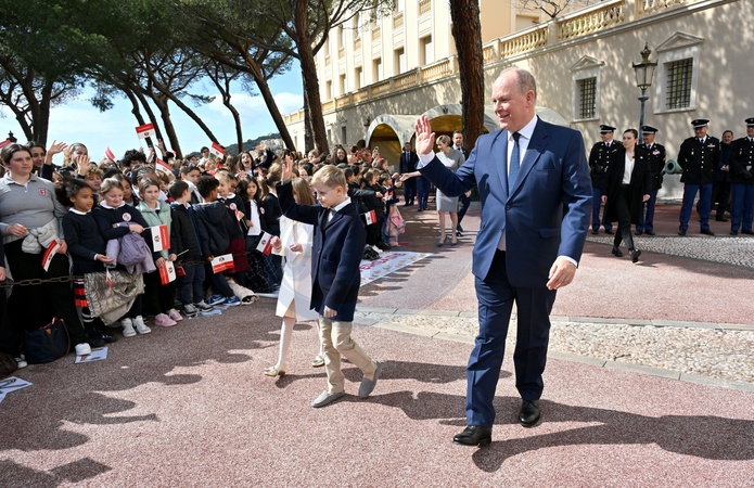 No Tabloid - Le prince Albert II de Monaco fête son anniversaire (66 ans) avec la princesse Charlène de Monaco et leurs enfants, le prince Jacques de Monaco, marquis des Baux, et la princesse Gabriella de Monaco, comtesse de Carladès, sur la Place du Palais princier de Monaco, le 14 mars 2024. © Bruno Bebert/Bestimage No Web pour la Belgique et la Suisse Just for Hello, OK and Grazia for UK - No Tabloid - Prince of Monaco celebrates his birthday (66 years) with his family on the Place du Palais princenier in Monaco, on March 14, 2024.