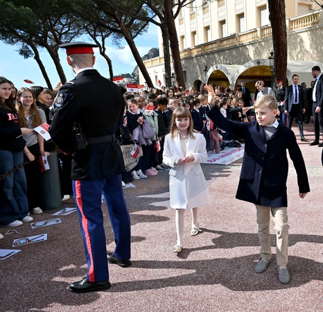No Tabloid - Le prince de Monaco fête son anniversaire (66 ans) avec la princesse de Monaco et leurs enfants, le prince Jacques de Monaco, marquis des Baux, et la princesse Gabriella de Monaco, comtesse de Carladès, sur la Place du Palais princier de Monaco, le 14 mars 2024. © Bruno Bebert/Bestimage No Web pour la Belgique et la Suisse Just for Hello, OK and Grazia for UK - No Tabloid - Prince of Monaco celebrates his birthday (66 years) with his family on the Place du Palais princenier in Monaco, on March 14, 2024.