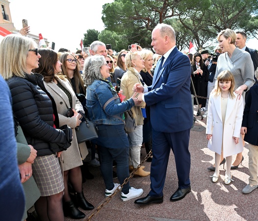 No Tabloid - Le prince Albert II de Monaco fête son anniversaire (66 ans) avec la princesse Charlène de Monaco et leurs enfants, le prince de Monaco et la princesse Gabriella de Monaco, comtesse de Carladès, sur la Place du Palais princier de Monaco, le 14 mars 2024. © Bruno Bebert/Bestimage No Web pour la Belgique et la Suisse Just for Hello, OK and Grazia for UK - No Tabloid - Prince of Monaco celebrates his birthday (66 years) with his family on the Place du Palais princenier in Monaco, on March 14, 2024.
