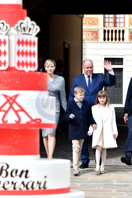 Książę Monako Albert II świętuje swoje urodziny (66 lat) z księżniczką Charlene z Monako i ich dziećmi, księciem Monako Jakubem i księżniczką Gabriellą z Monako na Place du Palais Princenier w Monako.