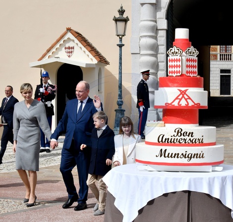 Książę Monako Albert II świętuje swoje urodziny (66 lat) z księżniczką Charlene z Monako i ich dziećmi, księciem Monako Jakubem i księżniczką Gabriellą z Monako na Place du Palais Princenier w Monako.