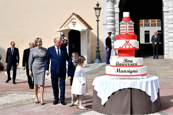 Książę Monako Albert II świętuje swoje urodziny (66 lat) z księżniczką Charlene z Monako i ich dziećmi, księciem Monako Jakubem i księżniczką Gabriellą z Monako na Place du Palais Princenier w Monako.