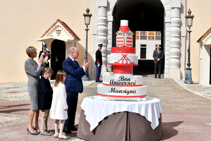 Książę Monako Albert II świętuje swoje urodziny (66 lat) z księżniczką Charlene z Monako i ich dziećmi, księciem Monako Jakubem i księżniczką Gabriellą z Monako na Place du Palais Princenier w Monako.