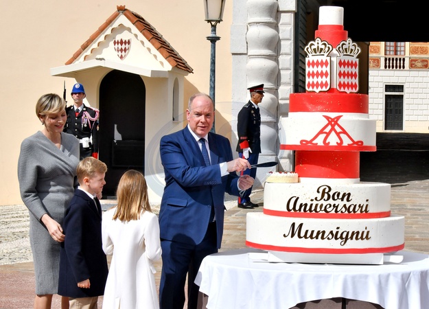 Książę Monako Albert II świętuje swoje urodziny (66 lat) z księżniczką Charlene z Monako i ich dziećmi, księciem Monako Jakubem i księżniczką Gabriellą z Monako na Place du Palais Princenier w Monako.