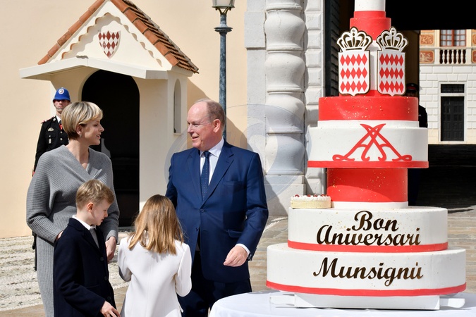 No Tabloid - Le prince Albert II de Monaco fête son anniversaire (66 ans) avec la princesse Charlène de Monaco et leurs enfants, le prince Jacques de Monaco, marquis des Baux, et la princesse Gabriella de Monaco, comtesse de Carladès, sur la Place du Palais princier de Monaco, le 14 mars 2024. © Bruno Bebert/Bestimage No Web pour la Belgique et la Suisse Just for Hello, OK and Grazia for UK - No Tabloid - Prince of Monaco celebrates his birthday (66 years) with his family on the Place du Palais princenier in Monaco, on March 14, 2024.