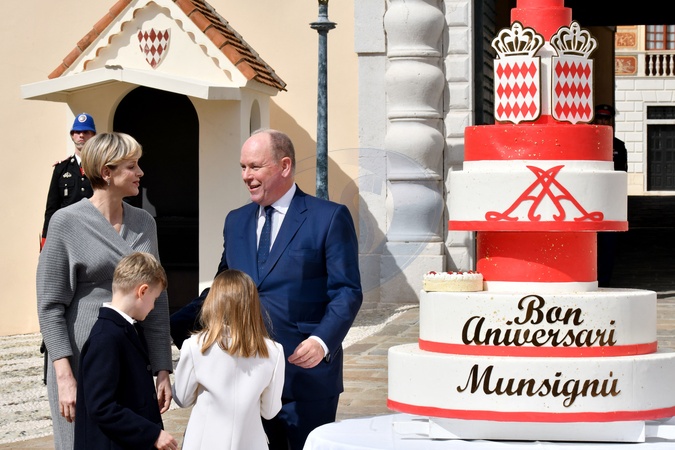 No Tabloid - Le prince Albert II de Monaco fête son anniversaire (66 ans) avec la princesse Charlène de Monaco et leurs enfants, le prince Jacques de Monaco, marquis des Baux, et la princesse Gabriella de Monaco, comtesse de Carladès, sur la Place du Palais princier de Monaco, le 14 mars 2024. © Bruno Bebert/Bestimage No Web pour la Belgique et la Suisse Just for Hello, OK and Grazia for UK - No Tabloid - Prince of Monaco celebrates his birthday (66 years) with his family on the Place du Palais princenier in Monaco, on March 14, 2024.
