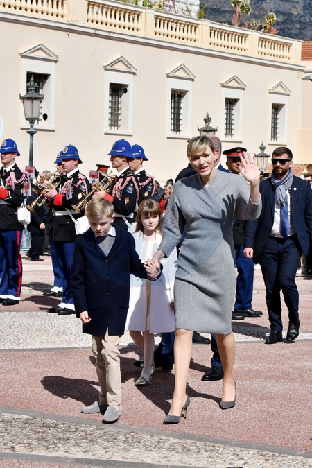 Książę Monako Albert II świętuje swoje urodziny (66 lat) z księżniczką Charlene z Monako i ich dziećmi, księciem Monako Jakubem i księżniczką Gabriellą z Monako na Place du Palais Princenier w Monako.