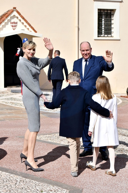 Książę Monako Albert II świętuje swoje urodziny (66 lat) z księżniczką Charlene z Monako i ich dziećmi, księciem Monako Jakubem i księżniczką Gabriellą z Monako na Place du Palais Princenier w Monako.