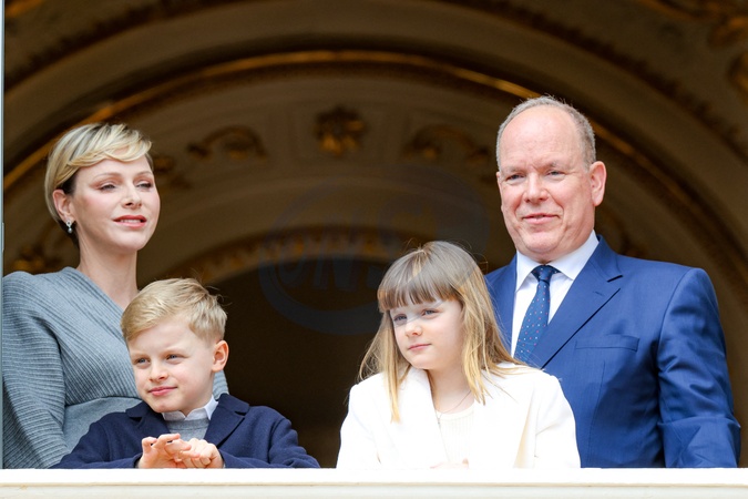 Książę Monako Albert II świętuje swoje urodziny (66 lat) z księżniczką Charlene z Monako i ich dziećmi, księciem Monako Jakubem i księżniczką Gabriellą z Monako na Place du Palais Princenier w Monako”