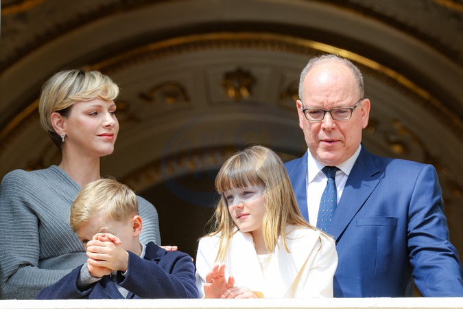 Książę Monako Albert II świętuje swoje urodziny (66 lat) z księżniczką Charlene z Monako i ich dziećmi, księciem Monako Jakubem i księżniczką Gabriellą z Monako na Place du Palais Princenier w Monako”