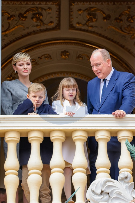 Książę Monako Albert II świętuje swoje urodziny (66 lat) z księżniczką Charlene z Monako i ich dziećmi, księciem Monako Jakubem i księżniczką Gabriellą z Monako na Place du Palais Princenier w Monako”